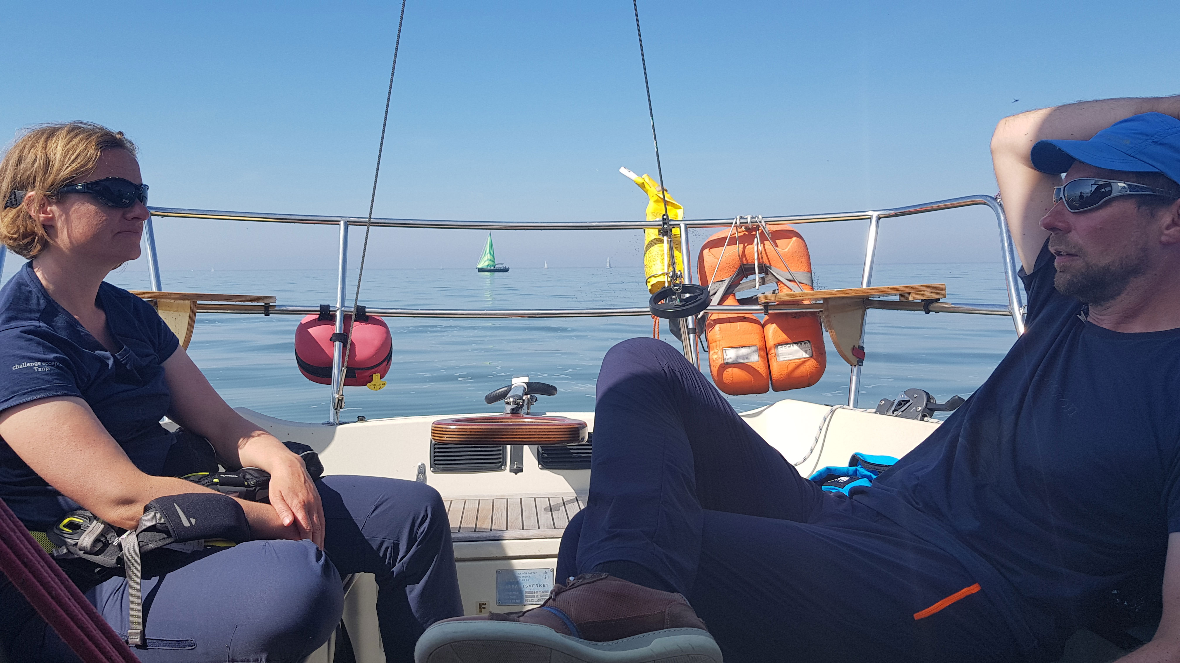 Samstag 24.08.2019 etwa 1 sm südlich SPORT-B: Der Wind ist schlagartig weg! Nichts, gar nichts. Alle Boote um uns herum liegen mit schlaffen Segeln und ohne jegliche Fahrt. Wie kann das sein? Alle Wetterapps sagen etwas zwischen 5-9 kn aus Ost voraus. Ratlosigkeit macht sich breit. Wolfgang packt den Spi aus doch das ist nur ein weiteres Desaster. Der Bergesack geht nicht voll nach oben und so fällt dieser auch sofort wieder ein! Dieser „doofe Spinkacker!“